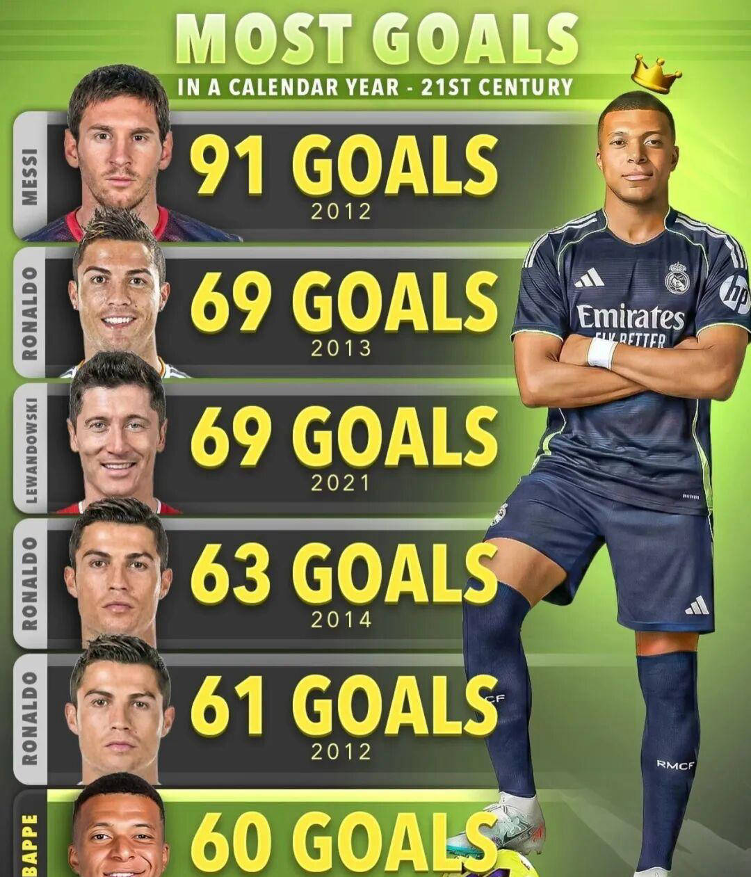 那么问题来了,接下来这一个月,姆巴佩能否在5场比赛中攻入10球?这个数字并非偶然,而是基于一份欧洲足坛经典排行榜的设定。这个排行榜以自然年个人正式比赛总进球数为衡量标准,历史上由梅西和C罗领衔。传奇记录属于2012年,梅西整年斩获91球,无论代表巴萨还是阿根廷国家队均囊括其中;而紧随其后的则是2013年C罗69球的高光表现。两者之间相差22球的巨大差距,使这数字堪称极难打破的天花板。